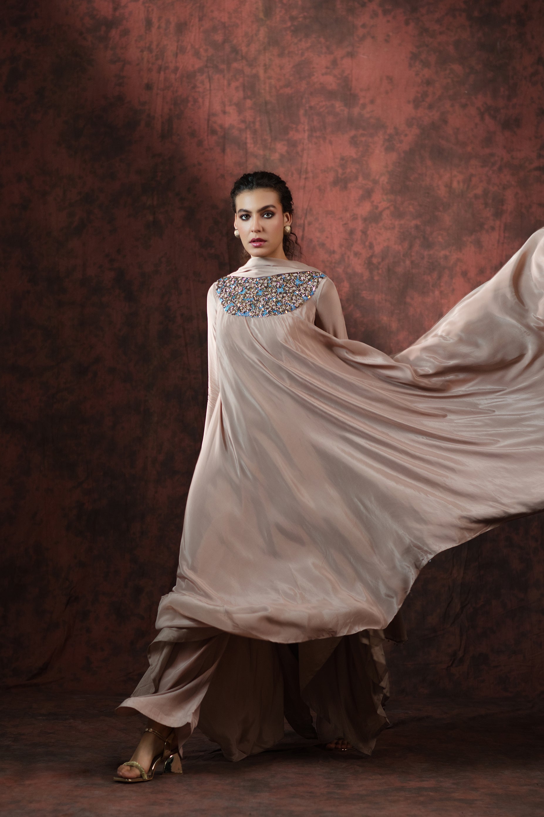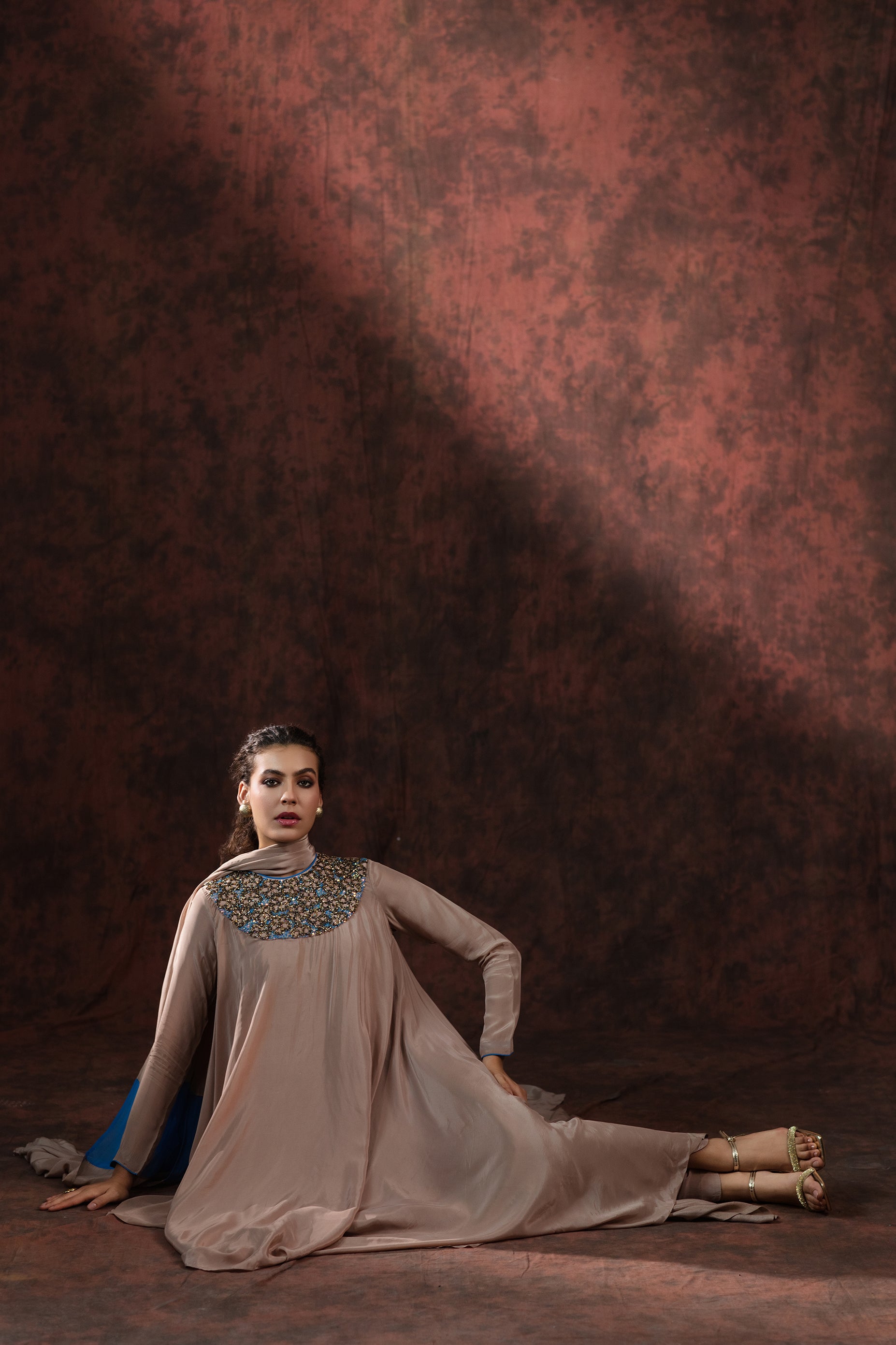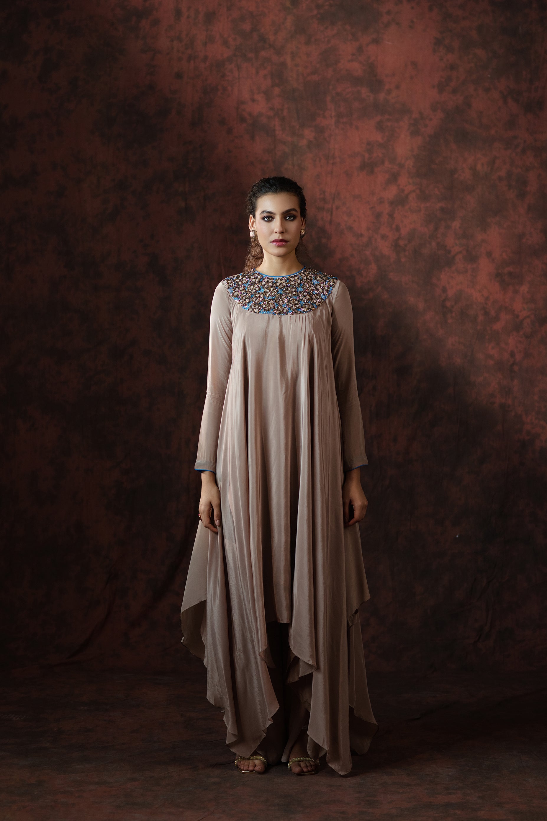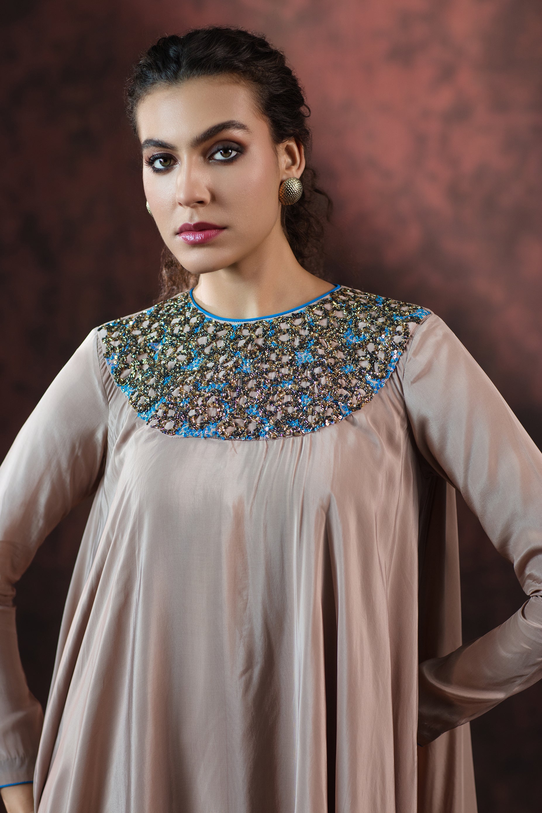 The focal point of this ensemble lies in its intricately hand-embroidered neckline, meticulously detailed with glimmering blue, bronze, and champagne-hued sequins. The delicate craftsmanship creates a celestial pattern that adds just the right touch of luminosity to the muted tone of the gown.