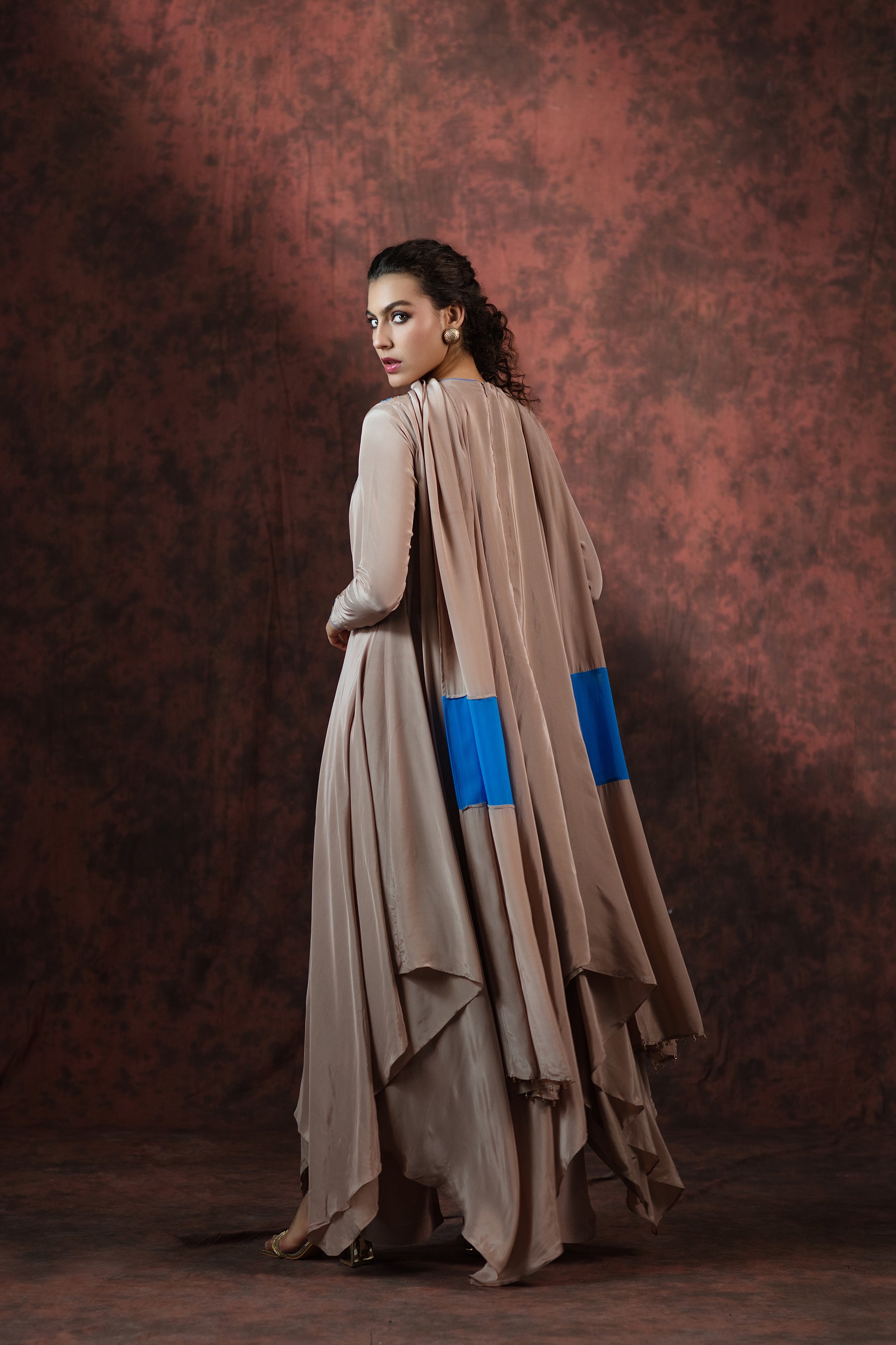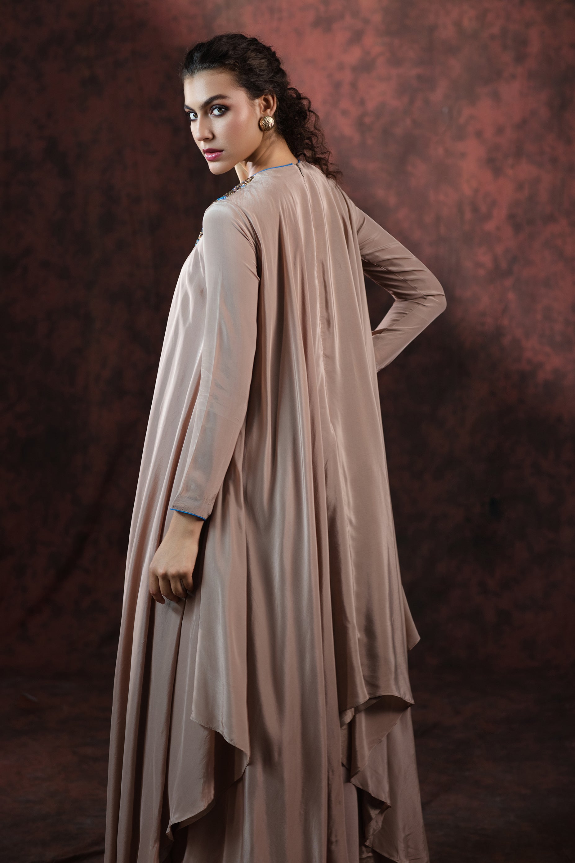 A vision of timeless elegance, the Moonlit Oasis Set blends fluid grace with exquisite craftsmanship. Designed in a soft silken taupe hue, this ensemble flows like liquid moonlight, draping the body in effortless sophistication. The silhouette features a free-flowing asymmetrical cut that moves with poetic ease, evoking a sense of calm allure.