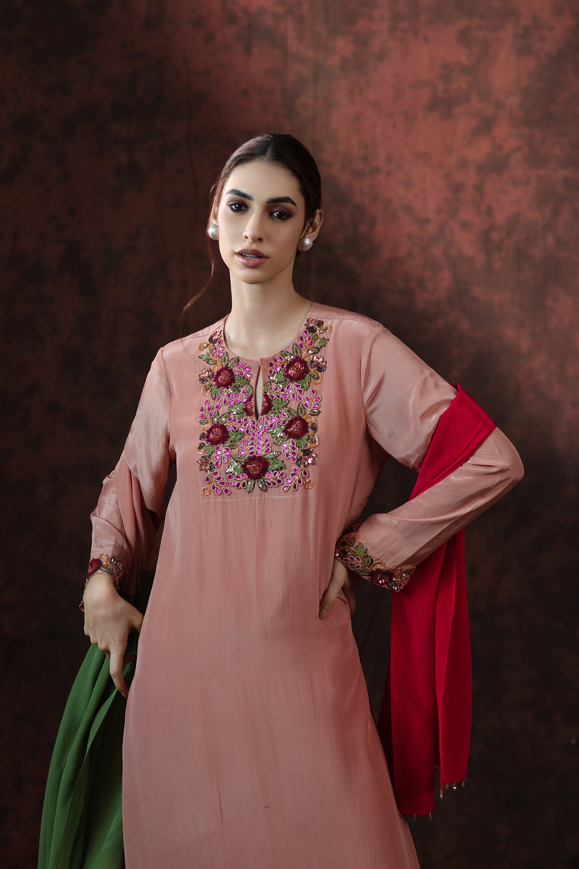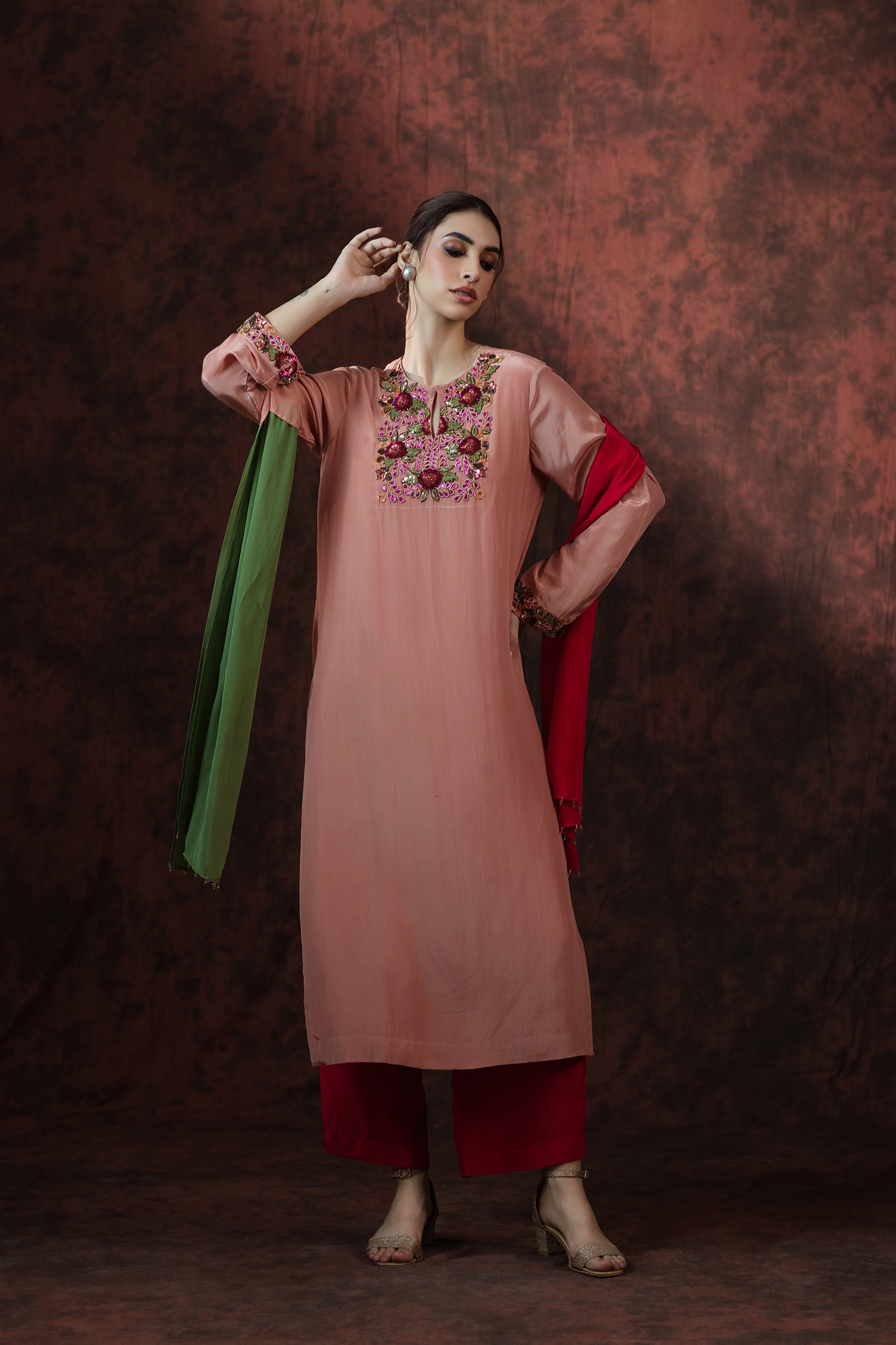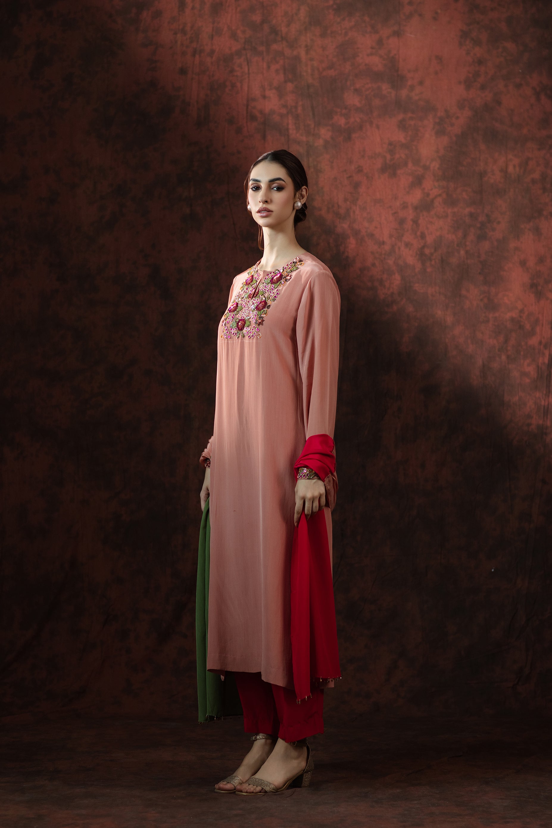Color: Blush peach kurta with craspberry trousers and dual-tone green-red dupatta