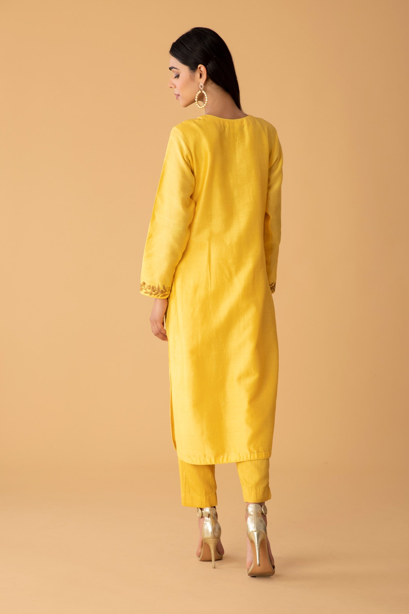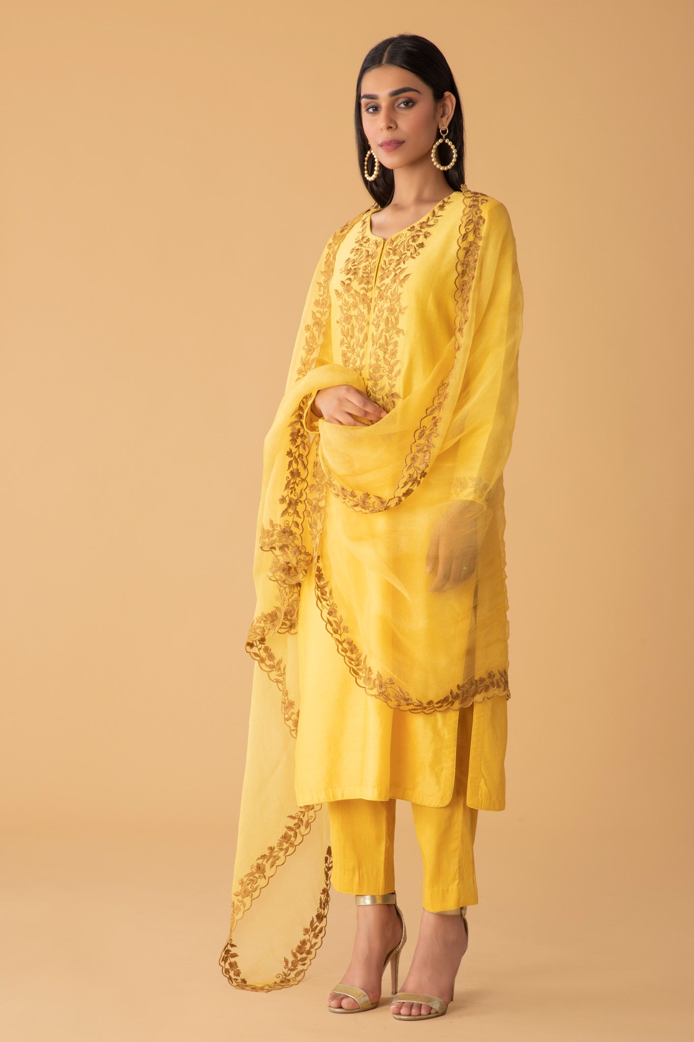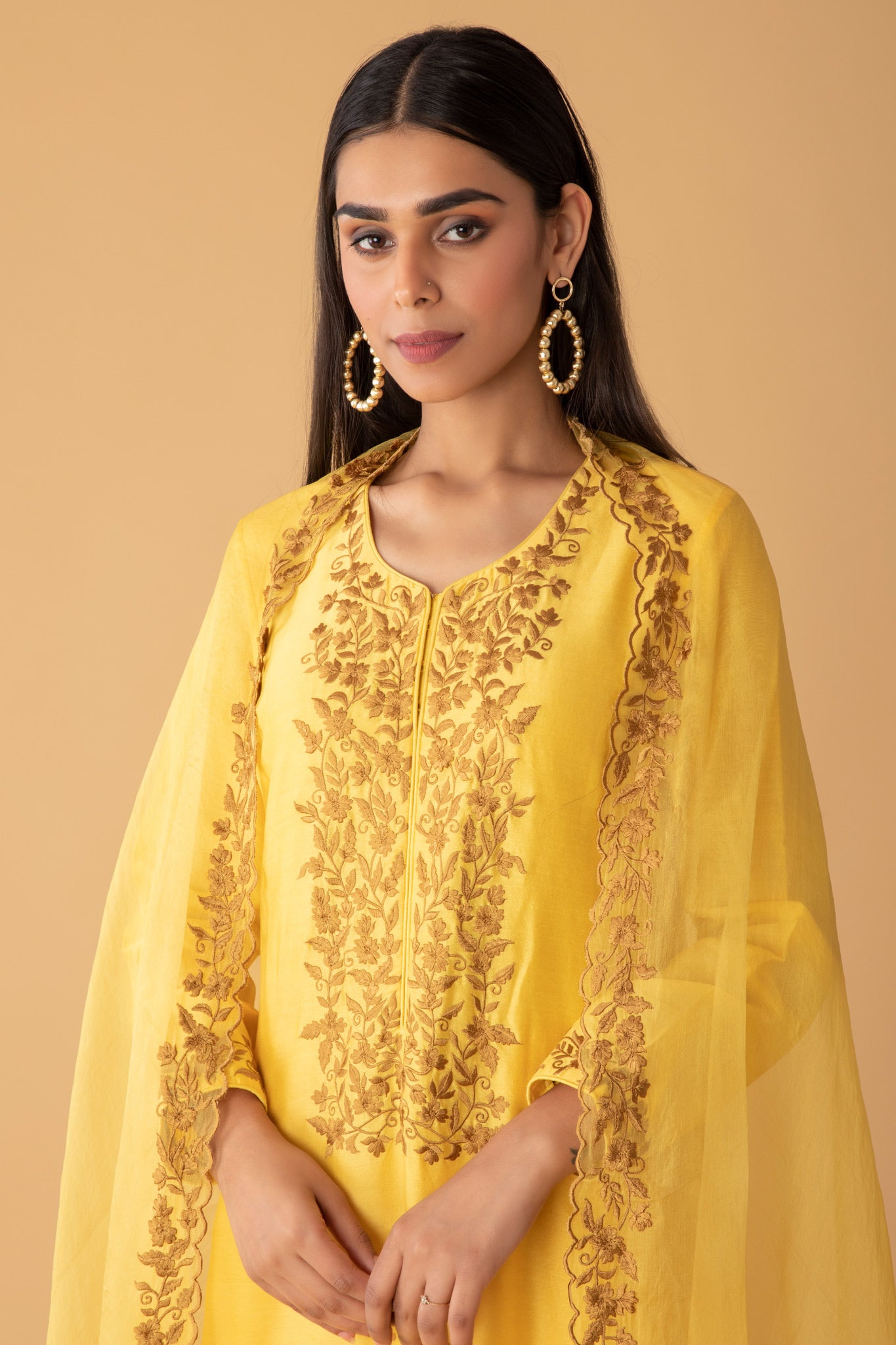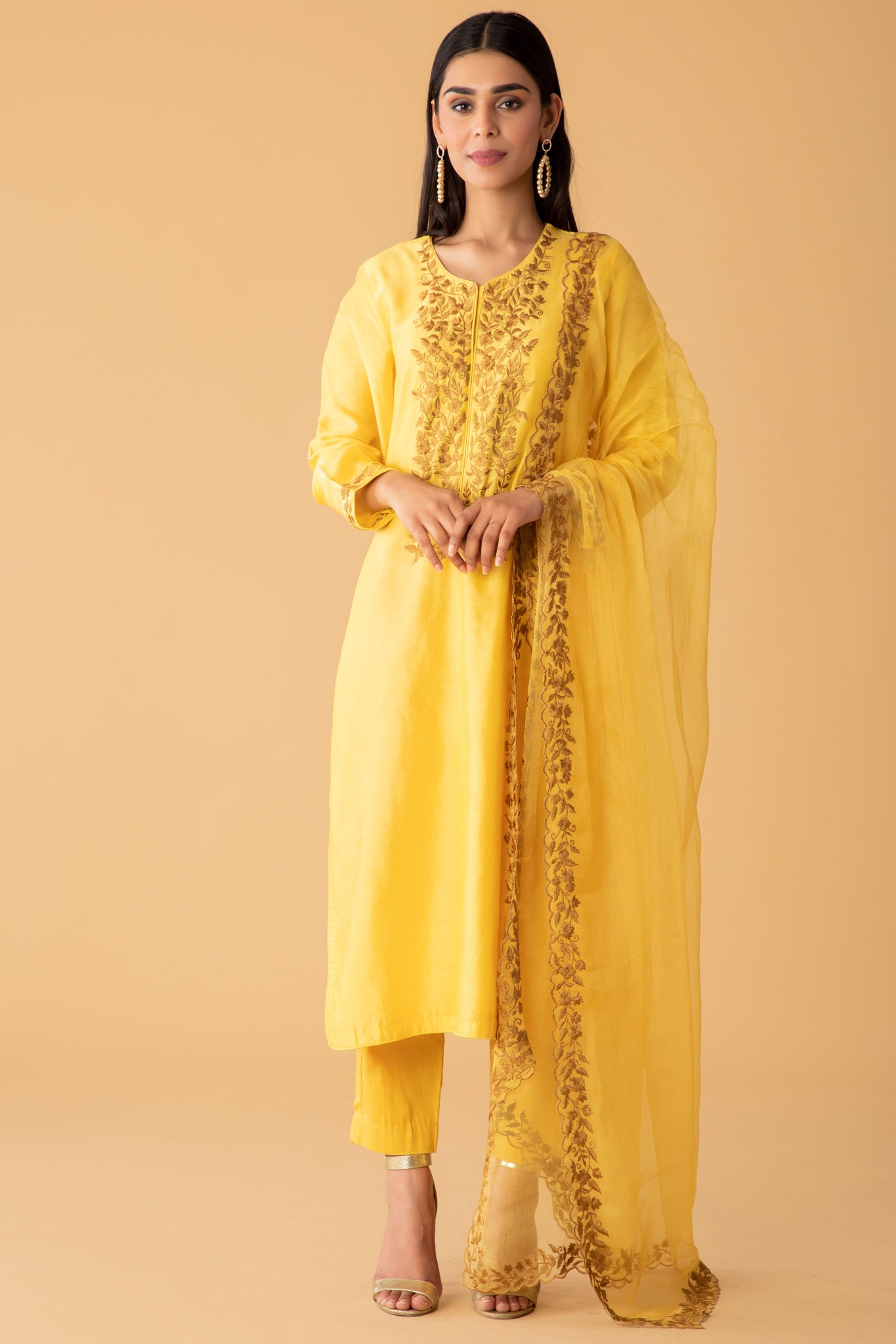 The setting sun ensemble is designed in gleamy chanderi fabric. It makes an excellent choice to wear in get-togethers. The beautiful set has U neck with a front placket. The butter-yellow ensemble has brown gold embroidery with silk threads on the neck, sleeves, and Odhani. The artisans had spent 5 days working on the graceful embroidery, it describes the free rhythm of fall breeze and autumn leaves. It is an ideal outfit for special get-togethers.
